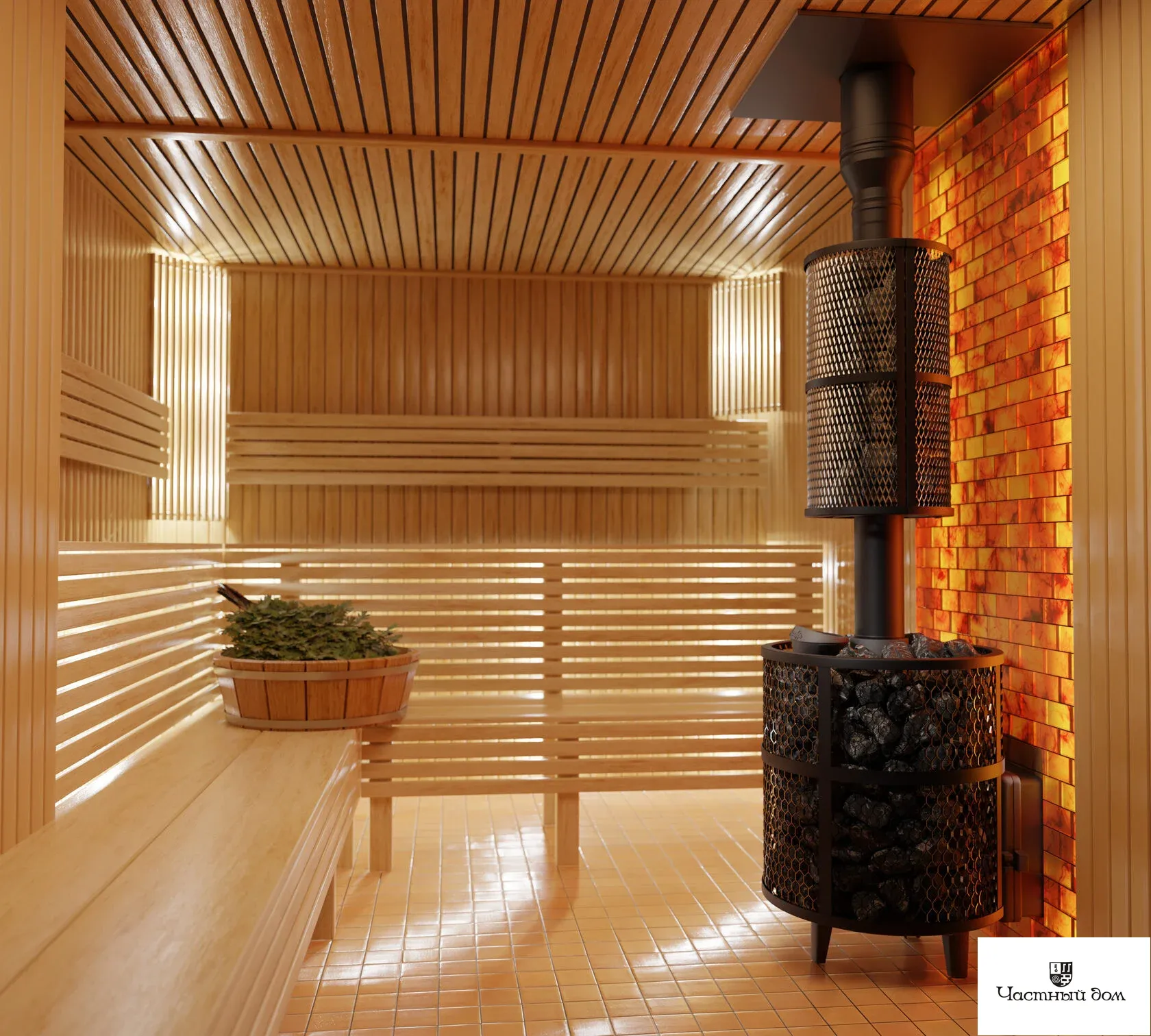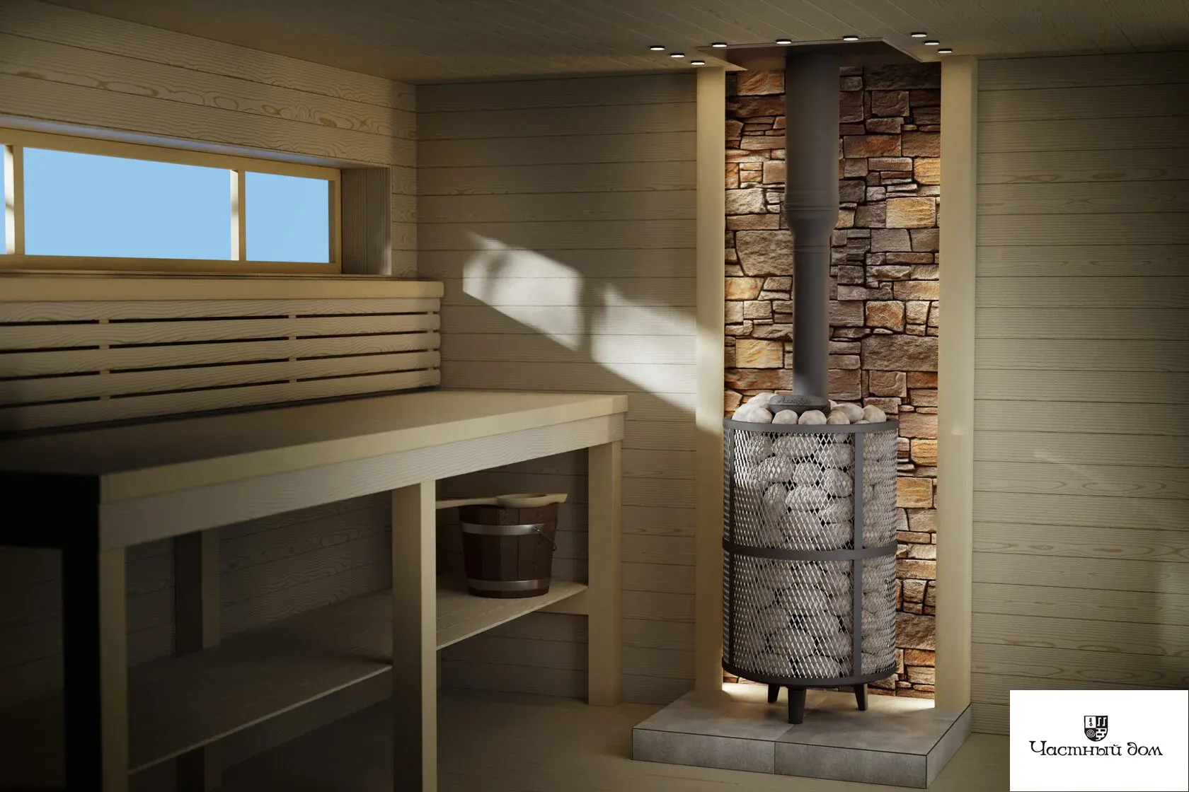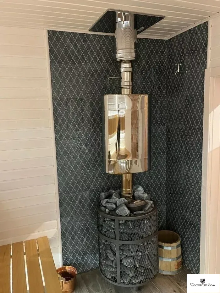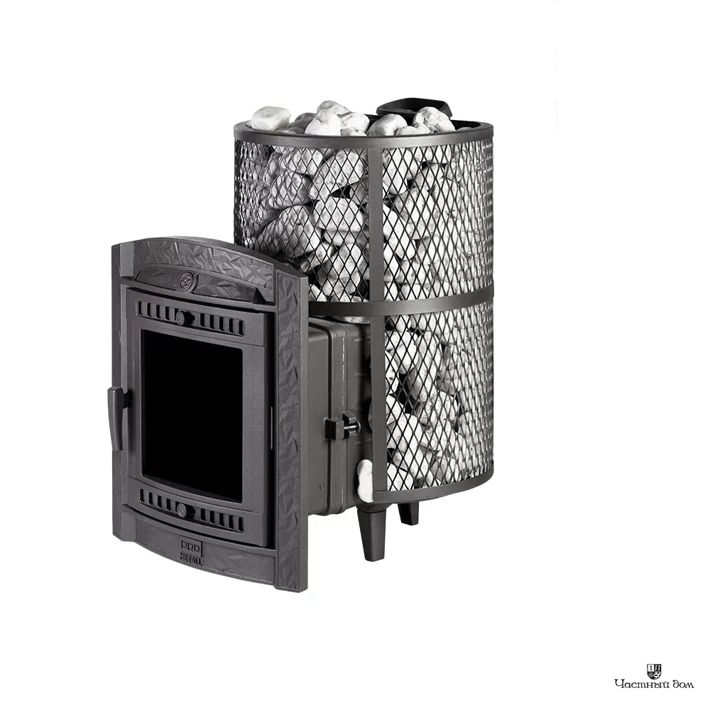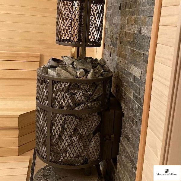 Компактная и экономичная модель. Кожух печи изготовлен в виде сетки из стали, который полностью заполняется природными камнями, обеспечивая высокую динамику нагрева парной.
